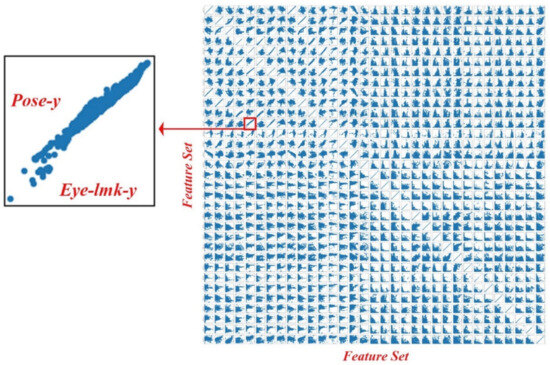 We explored the relationships between each feature and the target variable. The scatterplots for all feature combinations revealed intricate patterns, correlations, and trends, providing valuable insights for feature selection and modeling. A pairwise feature correlation matrix for a demonstrative user (Figure 2) uncovered complex data relationships, including noticeable linear and nonlinear associations between various pairs of variables, such as the average y-axis coordination values of pose and eye landmarks.