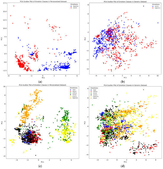 We applied principal component analysis (PCA) to the features and color-coded each data point (i.e., video frame) based on the corresponding emotion (Figure 3 displays a demonstrative example for 2 subjects. When comparing the plots for both the personalized dataset (one individual) and the generic dataset (all ten individuals), we observed a clear difference in the separation of data points relevant to each emotion class. We observe that the personalized dataset consistently yielded a better cluster visualization compared to the generic model, suggesting the potential of the downstream ML models to result in superior performance.