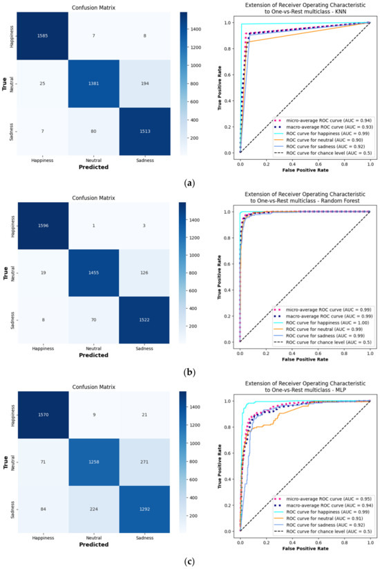 We trained three distinct ML models: k-nearest neighbors (KNN), random forest (RF), and a dense neural network (DNN). Each of these models was applied to analyze 51 extracted facial features from each video frame, ensuring a comprehensive approach to interpreting facial expressions. The facial features were carefully chosen for their interpretability and relevance in conveying emotional states. These features include key facial landmarks, expressions, and orientations, which are pivotal in differentiating between various emotions.