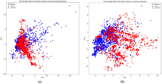 PCA plot for subject no. 39, contrasting the results in a personalized dataset (a) with those in a generalized dataset (b). In (a), the PCA scatter plot shows a blend of data points for “happy” and “neutral” emotional states, indicating a significant overlap and lack of clear separability in the personalized dataset. Conversely, (b) demonstrates a clearer distinction between the two emotional states in the generalized dataset. This comparison underlines the reason for the observed lack of performance improvement in emotion classification for this subject when using a personalized approach as opposed to a generalized one.