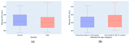 The independent samples t-test [71] was used to compare the ICVs of different genders (female (F); male (M)) and gestational age categories (extremely preterm (EP): <28 weeks; very preterm (VP): 28–31 weeks).