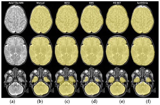 TEA brain T2w MRI of a preterm neonate (born at 29 weeks GA) in three different axial slices (a) (from bottom to top: slice numbers 9, 17, and 26) and corresponding overlapping brain masks (in yellow) from each BE method: (b) Manual, (c) BET2, (d) SWS, (e) HD-BET, and (f) SynthStrip.