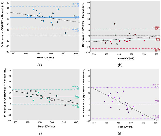 Bland–Altman analysis of the mean of (x-axis) and the difference between (y-axis) the automated BE methods and manually segmented ICVs. (a) BET2—Manual, (b) SWS—Manual, (c) HD-BET—Manual, and (d) SynthStrip—Manual. The full lines (blue, red, green, and purple) indicate the mean difference, the dotted lines (blue, red, green, and purple) indicate upper and lower limits of agreement (±1.96 standard deviations), the thinner dotted lines in grey represent zero (no difference), and the linear regression line is shown in black.