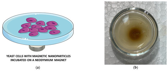 Experiment with a neodymium magnet: (a) Petri dish with yeast cells and magnetite nanoparticles placed on a neodymium magnet; (b) digital photograph taken during the experiment. The figure was created using Servier Medical Art templates, licensed under a Creative Commons Attribution 3.0 Unported License; https://smart.servier.com (accessed on 20 November 2023).