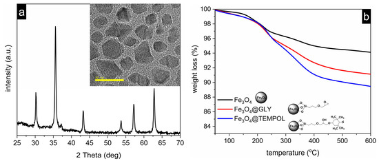 (a) XRD pattern and TEM image (inset) of Fe3O4 nanoparticles; (b) thermogravimetric curves of Fe3O4, Fe3O4@GLY, and Fe3O4@TEMPOL.