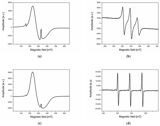 ESR is a suitable and direct method for studying materials with unpaired electrons, including free radicals [19,20]. In general, after placing the sample in a magnetic field, the Zeeman effect occurs, which involves splitting the energy levels of the unpaired electron. If the resonance condition is met and an appropriate quantum of radiation with energy corresponding to the energy difference between these levels is supplied to the system, the ESR phenomenon will be registered as the first derivative of the absorption signal [19,20,21]. It has been successfully applied in various studies, including those investigating the properties of magnetic nanoparticles [22,23,24,25,26,27], iron complexes and free radicals in blood and tissues [28,29,30,31,32,33,34,35], as well as geological and archaeological materials [36,37,38,39]. ESR studies confirm the penetration of nanoparticles into cells and facilitate monitoring of this whole process. Additionally, magnetic nanoparticles with attached spin labels (TEMPO or TEMPOL), as potential antioxidant agents, have been investigated for their possible use in treating inflammatory diseases, as radioprotectors in radiotherapy, and scavengers of free radicals in cells [17,32,40,41].