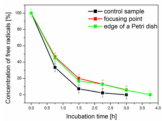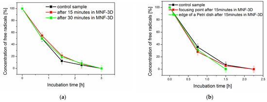An opposite tendency was observed in the second stage of this experiment (Figure 6b). The concentration of free radicals decreased faster in the sample exposed to a rotating magnetic field just before the measurement compared to the control sample. Such changes can probably be connected with the prolonged production of reactive oxygen species (ROS) in cells caused by a magnetic field [50]. For the significance level of 0.05, the results were statistically significantly different for the measurements performed after 0.75 h and 1.5 h (2 and 3 points in the graph). The effect of a rotating magnetic field on cancer cells was studied by Sharpe et al. [67]. An electromagnetic field increases the reactive oxygen species (ROS) level in cells. Additionally, a weak magnetic field can impact spin pairing with redox-active radicals. Thus, it may disrupt the flow of electrons in the mitochondrial electron transport chain. This could explain the faster decay of the ESR signal in the samples exposed to the rotating field in our experiment. The differences between the obtained results were not as apparent as in the case of the experiment with the neodymium magnet because the magnetic field induction was also much lower.