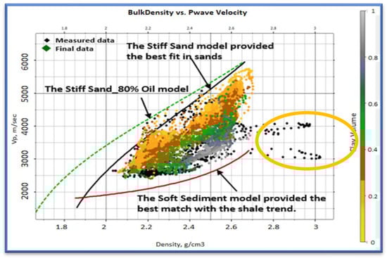 Vp versus density cross plot color-coded by Vclay (fraction). The model lines depict trends in rock physics based on a single mineral solid frame. The brown line represents the stiff sediment model, which is 100% quartz, while the red line represents the soft sediment model, which is 100% clay. The soft sediment model best represents all high clay lithologies, while the stiff sediment model covers the quartz lithologies. The highlighted data enclosed in yellow circle are the bad data that have been corrected using the rock physics models.