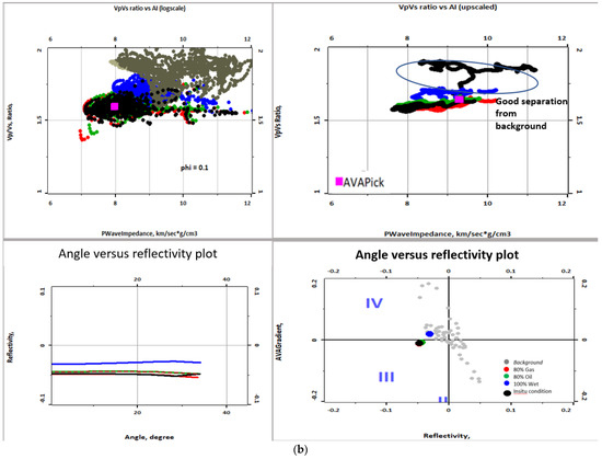 (a) Log plot showing the modeling results (in situ scenario). (b) Cross plots showing the modeling results (in situ scenario). Hydrocarbon sands displayed lower Vp/Vs and P-wave impedance (AI) values than wet sands. Strong ability to discriminate fluids, particularly in the AVA domain.