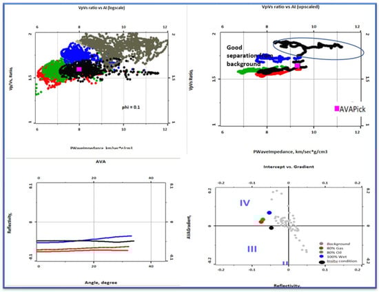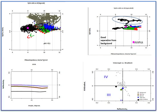 Cross plots showing the modeling results (PosVclay 0.2, Neg Por10 p.u. scenario). The sands’ good thickness makes them relatively suitable for lithofluid discrimination, even at reduced porosity (although the sensitivity is reduced).