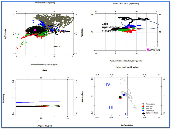 The results from the clay volume and porosity perturbation modeling (Figure 7, Figure 8 and Figure 9) illustrate how the elastic properties changed as the porosity, clay volume, and fluid changed. With increasing Vclay and reducing porosities, although the sensitivity is lowered, the sands are still suitable for lithology/fluid discrimination, due to their good thickness (Figure 7, Figure 8 and Figure 9). Figure 7 shows the modeling results of reducing the porosities by 10 porosity units, and we see that good separation from the background trend is still observed. Although the fluid sensitivity is reduced, but there is still a relatively fair separation between the fluid scenarios and in the AVA domain, the wet scenario shows a class IIP response, while the hydrocarbon scenario shows a class II response. Overall, the sands’ good thickness makes them relatively suitable for lithofluid discrimination, even at reduced porosity (although the sensitivity is reduced).