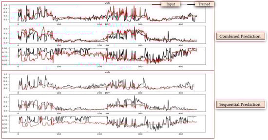 For the prediction, we apply the neural network to simultaneously predict the shale volume, porosity, and water saturation (simultaneous workflow). After this, we adopt a sequential workflow, where the shale volume is predicted initially, and subsequently include the shale volume in the training input and predict porosity. Finally, both shale volume and porosity are used to predict water saturation.