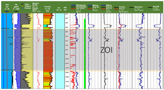 Next, we conduct a thorough quantitative examination of the well-log and core data. After that, a set of physical relations is calibrated to ascertain the viability of obtaining petrophysical parameters from the seismic inversion results. This calibration involves porosity, saturation, and mineralogy estimations. The well logs are also analyzed to determine the most significant reservoir zones of interest (ZoI). These zones are then analyzed for lithology and fluid saturation with the help of petrophysical models.