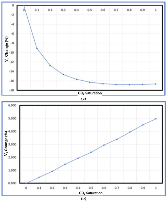 (a) P-wave velocity change versus CO2 saturation. An abrupt drop in P-wave velocity values, especially between 0 and 0.2 CO2 saturation, and (b) S-wave velocity change versus CO2 saturation. CO2 saturation has a direct relationship with S-wave velocity.
