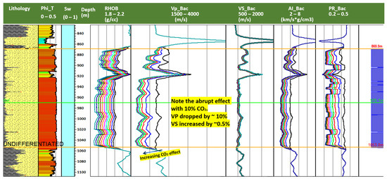 Fluid modeling results from left to right: lithology, porosity, saturation, depth density, Vp, Vs, AI, and PR tracks. The arrow shows the decreasing CO2 effect.