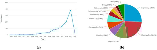 Search results in the Scopus database: (a) published documents by year; (b) published documents by subject area [25].