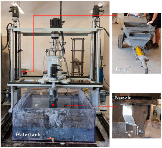 Another trial was performed on the development of systems for cementitious materials. This technology was primarily connected with a robot arm to print concrete materials underwater, layer by layer. This makes it possible to transform design drawings directly into real infrastructure elements [21,26,27]. Currently, the devices dedicated to the underwater research of cementitious materials are most often located in the air and only a nozzle works underwater (Figure 2).