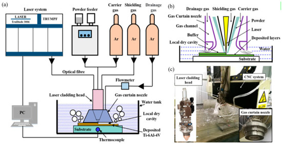 The test setup. (a) Schematic diagram of the underwater printing system; (b) diagram of the underwater laser–material interaction process; (c) the actual manufacturing process of underwater LMD. Source: [49].