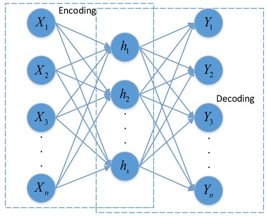 An auto-encoder (AE) [31] is an unsupervised learning neural network model that automatically learns the features of raw data and consists of input, hidden, and output layers. Its network structure is shown in Figure 1. The coding network is composed of an input layer and a hidden layer, and the decoding network is composed of a hidden layer and an output layer. The coding network extracts the features from the original data, and the decoding network restores the input data through the features.