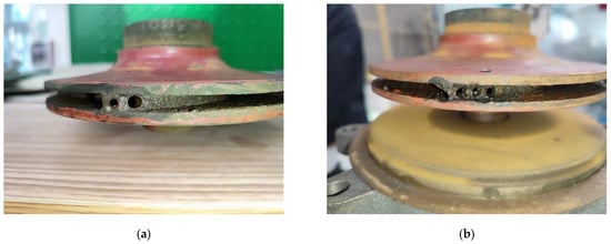A unidirectional acceleration sensor was arranged in the MCP volute on the test bench. The sampling frequency was 20,000 Hz, and the sampling time was 0.1 s. First, the vibration signal under the normal state (S1) of the MCP was collected. The operating condition was rated and the speed was 2900 r/min. In order to simulate the MCP impeller cavitation, the MCP impeller was drilled and the cavitation degree of the MCP was defined according to the number of holes drilled in the impeller. These were either 1 hole in the impeller (S2), 2 holes in the impeller (S3), 2.5 holes in the impeller (S4), 3 holes in the impeller (S5), 4 holes in the impeller (S6), 5 holes in the impeller (S7), 6 holes in the impeller (S8), or 6 holes in the impeller with side wear of the impeller (S9). The operating conditions remained the same as S1, and the MCP vibration signals under these 8 states were collected successively. A total of 250 sets of vibration signal data were collected in each state. Figure 5 shows the impellers in S3 and S9.