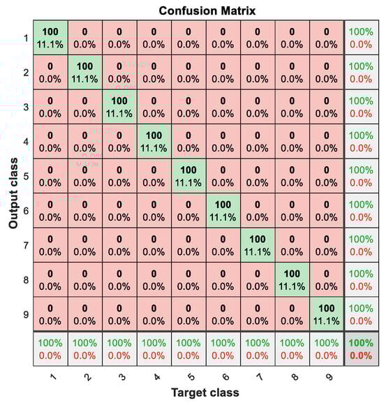 The extracted feature parameters were input into the classifier for classification training and verified through the test set. The verification matrix is shown in Figure 9. As can be seen from Figure 9, after feature extraction via the SSAE, the MCP status recognition accuracy reaches 100%, and the effect is very good.
