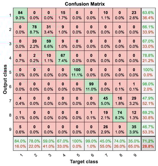 The time domain features of nine statuses have been randomly selected for display, as shown in Figure 10. As can be seen from Figure 10, the time domain feature differentiation between different MCP statuses is very poor. The 16 time domain features of the training set were input into the classifier for classification training. The confusion matrix verified with the test set is shown in Figure 10. As can be seen from Figure 11, the overall accuracy of MCP status recognition using this method is only 71.2%, and the effect is not good.