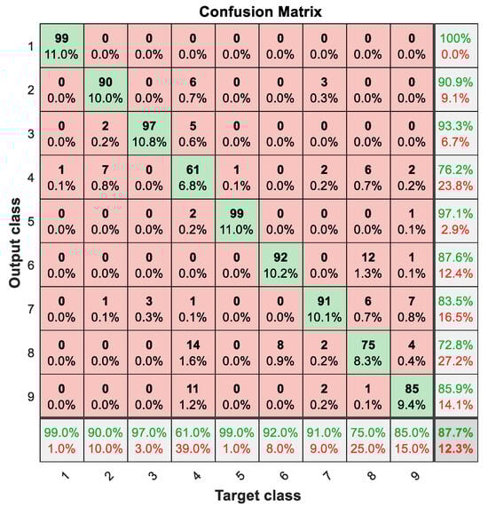 The training set was decomposed into VMD: each signal was decomposed into five modal components, and the fuzzy entropy of the five modal components was calculated. The fuzzy entropy trends under nine states are shown in Figure 12, below. It can be seen from Figure 11 that the trend of fuzzy entropy can roughly distinguish between different statuses of the MCP, but the fuzzy entropy trends in the S1 state and S6 state are close. Five fuzzy entropy features in each state of the training set were input to the classifier as features for training. The confusion matrix verified with the test set is shown on then Figure 12. As can be seen from Figure 13, the overall accuracy of MCP status recognition with this method is 87.7%, and the effect is much better than that of the time domain characteristics method.