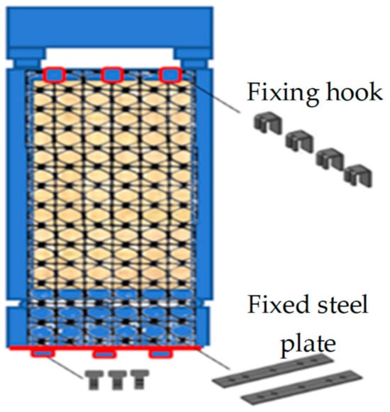 When conducting the four-way geogrid–soil interface shear test using the system, it is essential to ensure that the geogrid remains tightly secured and its relative position with the lower box remains unchanged. Since the geogrid cannot be fixed between the upper and lower boxes upon delivery of the instrument, a modification has been made to prevent any horizontal movement, deflection, or folding of the geogrid during shear testing. A self-designed four-way geogrid fixing device has been implemented for this purpose. As Figure 4 illustrates, this device consists of a fixed steel plate and four hooks for securing the geogrid. The geogrid fixing device effectively secures the geogrid on the horizontal plane of the lower box to maintain its tautness throughout cutting operations. During usage, one side of the geogrid is firmly affixed to the front of the lower shear box using a fixed steel plate, while another side is fastened to it with a grille fixing hook. During the cyclic shear test, the upper shear box is fixed, and the lower shear box starts the cyclic shear from the equilibrium position and finally returns to the equilibrium position.