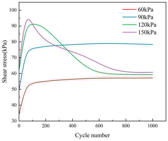 Figure 6 displays the graphs for the average peak shear stress variation at the interface of the soil reinforced with a four-way geogrid subjected to various normal stresses and numbers of cyclic shear. The results demonstrate that both the initial shear stress and peak interfacial strength increase as normal stress is raised. Specifically, when σ increases from 60 kPa to 150 kPa, there is a 31.02 kPa increase in initial shear stress and a 41.60 kPa increase in peak interfacial strength. This aligns with the Moore–Coulomb strength criterion, indicating that material shear strength increases with increasing normal stress. When the stress is equal to 60 kPa or 90 kPa, the peak shear stress rises with the growing number of cycles, ultimately stabilizing. Furthermore, the larger the stress, the greater the number of cycles required for stabilization. Moreover, the geogrid reinforcement–soil intersection depicts shear-strengthening properties. When the stress level is 120 kPa and 150 kPa, the peak shear stress increases with the number of cycles, subsequently decreasing and eventually stabilizing. Additionally, the number of cycles needed to attain the interfacial residual strength increases with the growth in stress level. During this phase, the interfacial residual strength does not undergo significant alterations, and the geogrid–soil interface displays shear-softening characteristics. This result is very similar to the experimental results of Wang et al. []. The possible cause of this phenomenon is that the value of σ is too high, which exacerbates the deformation and wear of the grid during the shearing process. As a result, the interlocking effect between the soil and the grid weakens. The greater the vertical stress, the smaller the corresponding cycle times when reaching the peak shear stress can be observed simultaneously []. With increased vertical stress, soil particles densify at a faster rate, leading to earlier interlock between soil particles and grille []. Consequently, the appearance of peak shear stress occurs earlier within the entire cycle.