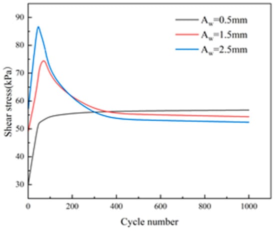 Figure 8 displays the curves depicting the alternating shear stress at the interface of the geogrid and soil. The curves show the changes in the average peak stress with the number of cycles for different amplitude values of displacement at a normal stress of 120 kPa and f = 0.5 Hz. The increase in Aw leads to an increase in both the initial shear stress and peak interface strength. When Aw increases from 0.5 mm to 2.5 mm, there is a 26.95 kPa increase in initial shear stress and a 32.65 kPa increase in peak interfacial strength. When Aw = 0.5 mm, the average peak shear stress curve increases rapidly at the beginning of the cycle and then stabilizes. However, for Aw values of 1.5 mm and 2.5 mm, the average peak shear stress rapidly reaches the peak strength of the interface at the beginning of the cycle and then decreases rapidly and finally stabilizes. In the shearing process, the sand particles are crushed by collision, and the crushed fine particles fill the pores between the coarse sand particles. The density of the sand particles near the interfacial shear zone increases, leading to an increase in the average peak shear stress. At the same time, the grating will be worn down by the constant collision with sand and soil, causing the peak shearing stress to decrease. When the Aw is small, the degree of grating wear is small and the degree of particle fracture increases with the number of cycles and then tends to stabilize, so there is an overall trend of shear hardening. When the Aw is larger, the particle crushing and the grating breakage become more intense, so that the peak value of the average shear stress shows a trend of hardening and then softening. The phenomenon that grids exhibit different shear properties at different shear displacement amplitudes is the same as the findings of Liu et al. []. Moreover, the phenomenon that the interfacial residual strength decreases with increasing Aw can also be explained by the above point of view.