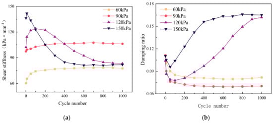 Figure 10a shows that the shear stiffness of the geogrid–soil interface changes differently under various normal stress levels. When the normal stress level is low, the shear stiffness gradually increases with the number of cycles. The smaller the σ, the more cycles are required for the shear stiffness to reach its maximum value. Under high normal stress conditions, the shear stiffness reaches its maximum value with fewer cycles as stress increases. Additionally, the rate of decline is faster with larger values of σ. This phenomenon may be due to the wear and deformation of the grating under high stress, which causes particle breakage and a decrease in the interface’s ability to resist deformation. The larger the value of σ, the greater the degree of wear and tear on the grating and particles, resulting in a faster degradation of the interface’s strength []. The damping ratio decreases with an increase in cycle times under low normal stress and tends towards a stable value. Conversely, under high normal stress, the damping ratio increases with an increase in cycle times and tends toward a stable value. This suggests that the geogrid is not deformed under low normal stress, resulting in relatively low interfacial energy dissipation. However, under high normal stress, the geogrid is deformed, leading to an acceleration in interfacial energy dissipation [].
