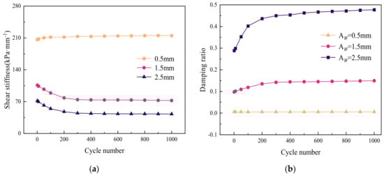 - The area of the hysteresis loop increases as the shear displacement amplitude increases. Under the same number of cycles, a larger shear displacement amplitude corresponds to a smaller shear stiffness and a larger damping ratio.