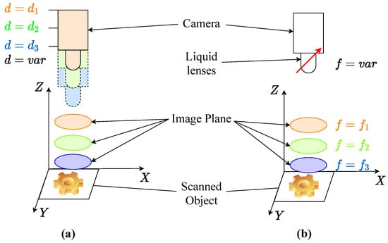 Classic solutions were based on moving the imaging plane with the optics and camera on the z-axis. This method allowed the capture of image series of the XY-plane from different heights due to the camera’s movement in the z-axis (Figure 1a). The time required to register the image series depended on the number of images and the speed of the camera. The disadvantage of this solution is the presence of a motor installed on the z-axis of the vision system which propagates vibrations when the position of the image plane changes [,].