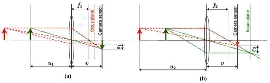 Figure 4a shows the layout after aligning the image plane with the green arrow (). The green arrow will be captured on the sensor in focus. The red arrow, on the other hand, will be significantly blurred in the image. The tipping point of the arrow is being focused before the camera sensor. In the digital image, the red arrow tip will be blurred on the surface of a circle of confusion with diameter .