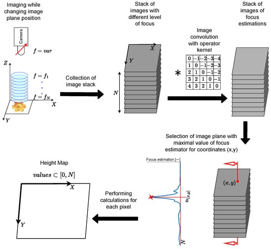 A three-dimensional matrix containing the focus estimations is obtained by applying the operators from the Table 3 to the acquired images. The estimation is calculated for each pixel of the captured images. In order to obtain a height map, it is necessary to compare the focus estimations in a z-axis (Figure 5).