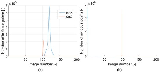 This study confirms the applicability of both proposed focus plane selection methods. The method based on the maximum function proves sufficient for most cases considered. The absence of floating-point calculations results in less computing power and the possibility of using hardware acceleration methods [,,]. The CoG method allows for the increased resolution in the z-axis. RMSE errors for the CoG method have been lower than for the maximum method.