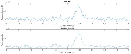 The plot of the focus factor value as a function of the change in optical power. The plot compares the unfiltered profile and after median filtering with window size 3.