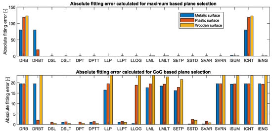 Figure 9 shows the results obtained. Separate plots have been prepared for the two focus plane selection methods. The bar chart shows the AFE value. The colours of the bars correspond to the measurements made for the different surface types.