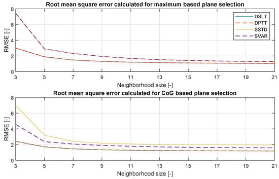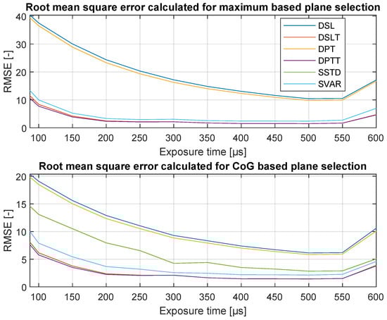 Noticeable differences can be observed in Figure 15. It shows the value of the RSME error as a contrast function for both methods of determining the focus plane. A noticeable trend is that the error decreases with increasing contrast. This is a common trend for each of the operators considered. Operators achieve the best results with a variable kernel size. For the maximum method for times above 100 µs, the RMSE error remains below 10. For exposure time above 200 µs, it reaches values below 4. For the CoG method, performance improvement for the DSLT, DPTT, and SVAR operators is noticeable. For exposure time above 150 µs, the error value falls below 5.