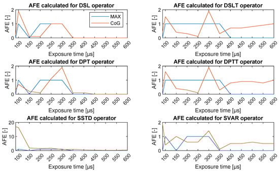 The impact of contrast was examined indirectly by changing the sensor exposure time. Changes in contrast had a marginal effect on the AFE value. The exception was the SSTD operator, which significantly deviated in AFE error value for exposure times below 150 µs. The low error values did not allow a trend in the effect of contrast on AFE to be observed.