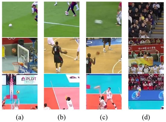 We classify sports video images into two types, easy and difficult, according to the complexity of the sports competition scene. Simple refers to a clear boundary between the ball and the background, which can be easily distinguished and has the least classification difficulty, as Figure 2a shows. Difficulties include different factors such as occlusion, motion blur, and background blending. Occlusion means that part of the ball is covered by the player, but the complete position of the ball can still be inferred based on the remaining part, as shown in Figure 2b. Motion blur refers to the fact that when the ball is moving at high speed, and due to shooting reasons, the ball has a relatively long shadow, no obvious boundaries, and the most severe deformation, as shown in Figure 2c. Background integration means that the ball is completely integrated into a similar background, such as billboards, auditoriums, etc., as shown in Figure 2d. This article uses simple samples as the benchmark when constructing the training data set. For each difficult situation, resampling is performed according to the resampling factor. The samples marked as difficult are repeated multiple times to form a new training fine-tuning data set. In this way, we perform difficult sample mining to improve ball detection capabilities in complex motion situations.