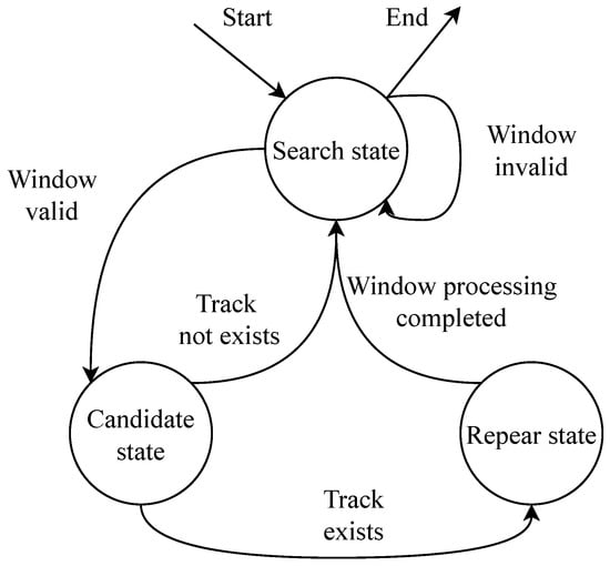 Trajectory correction algorithm. Automatic trajectory correction adopts the idea of sliding windows and the form of a finite state machine (FSM) [37] to handle the above situations automatically. Finite state machines can be divided into three states, showed as Figure 5. The search state is used to find the left boundary of a suitable sliding window. If found, a sliding window can be constructed and entered into the candidate state for verification processing. Otherwise, the left pointer will be moved until it is found or reaches the end. The candidate state is to check whether the detection set in the current window can extend the ball trajectory. Trajectory fragments may both extend the old trajectory and serve as a new beginning. Extending the old trajectory as much as possible can reduce the number of trajectory segments and improve the overall stability of tracking. The repair state is to repair the deviation detection in the window according to the simple linear motion model or to interpolate the missing detection to improve the tracking accuracy as much as possible.