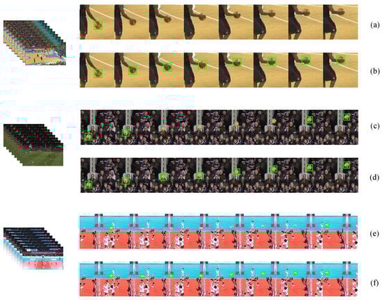 Figure 7 shows the advantages of our method for ball tracking in the presence of occlusion, motion blur, and blend in the background. Figure 7 shows an example of tracking results comparing our method with other methods. We selected three situations with tracking difficulties: occlusion, motion blur, and background blending. In frames 29 to 36 of the fourth clip of SportsTrack’s basketball test set, the player’s hands obscured the basketball. (a) and (b) in Figure 7 are screenshots of the basketball part of these eight consecutive images. Other methods did not track the basketball, as shown in Figure 7a. In contrast, our method tracks all basketballs with hand occlusion. In frames 352 to 359 of the first clip of SportsTrack’s soccer test set, the soccer ball blends into the background of the auditorium. Figure 7c,d is screenshots of the soccer part of these eight consecutive images. Other methods did not track the soccer player, as shown in Figure 7c. In contrast, our method tracks the entire ball in a situation where the ball is very similar to the head in the audience, as shown in Figure 7d. In the first clip of SportsTrack’s volleyball test set, motion blur occurs from frames 97 to 104 due to the excessive speed of the volleyball. Figure 7e,f is screenshots of the volleyball part of these eight consecutive images. The blurred volleyball was not tracked by other methods, as shown in Figure 7e. In contrast, our method tracks all volleyballs, as shown in Figure 7f.
