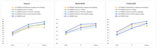 First, we conducted ablations on the components of the Heuristic Compound Sampling Strategy. In the actual video of the ball team sports competition, there are long-shot videos, close shots, and close-up videos. Even in the same long shot or panoramic shot, as the position of the ball changes in the court, the position between the ball and the camera will also change. Therefore, the relative size of the balls changes as the camera moves or the ball itself moves. We not only want to detect and track smaller balls in the distance but also capture larger balls in the distance. Secondly, in actual sports videos, there is only one valid ball object by default. Therefore, after the original image is randomly cropped to the size of the network input, there is a large gap in the number of positive samples containing the ball object and negative samples that do not contain the object, resulting in positive and negative samples being severely imbalanced. Finally, there are often unusual situations such as occlusion and motion blur in team ball sports scenes. In order to verify the effectiveness of the heuristic composite sampling strategy, we constructed different sampling strategies for ablation experiments: (a) HMMATrack random cropping and random sampling, and other structures remain unchanged; (b) HMMATrack (w/o tilling): the tilling sampling mechanism is not used, and the detection and tracking network remains unchanged; (c) HMMATrack (w/o heuristic sampling): heuristic sampling is not used, and other structures remain unchanged; (d) HMMATrack (w/o hard sample mining): uses random sampling without distinguishing between hard samples and ordinary samples, and other structures remain unchanged; and (e) HMMATrack: complete sampling, detection, and tracking pipeline. From the results of Figure 8, it can be seen that the tracking effect obtained by using the complete sampling strategy is the best.