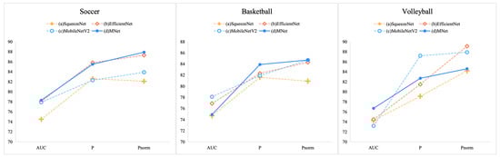 In order to verify the effect of the MNet backbone network proposed in this article, we conduct lightweight backbone networks SqueezeNet [46], EfficientNet [47], and MobileNetV2 [48] as comparison models. Four sets of comparative experiments were designed: (a) SqueezeNet; (b) EfficientNet; (c) MobileNetV2; and (d) MNet. In these comparative experiments, only the backbone network was modified, and other structures remained consistent. It can be seen from Figure 9 that using the MNet backbone network proposed in this article can better capture smaller ball objects.