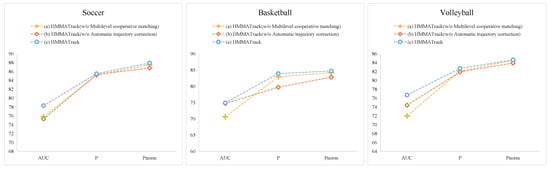 In order to further objectively analyze the effectiveness of our proposed tracking algorithm, we designed three sets of comparative experiments: (a) HMMATrack (w/o multilevel cooperative matching): does not use multilevel cooperative matching but only uses the classic Kalman filter matching algorithm other structures remain unchanged; (b) HMMATrack (w/o automatic trajectory correction): the automatic trajectory correction module is not used, and other structures remain unchanged; and (c) HMMATrack: the complete HMMATrack framework. It can be seen from Figure 10 that the ball trajectory obtained by the tracking model using the complete trajectory correction algorithm has better continuity.