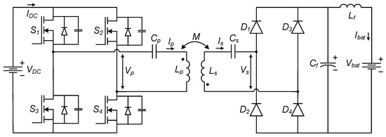 where is the primary (source) voltage, and are currents of the primary and secondary coils, are the resistances and inductances of the primary and secondary coils, are the capacitances of primary and secondary compensation capacitors, respectively, is the mutual inductance, is the angular frequency, and is the voltage induced in the secondary coil , while is the load resistance, representing the EV battery, seen from the AC side of the secondary (receiving) coil (Figure 1 and Figure 2) [26].