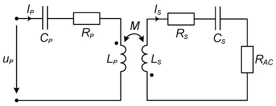 A WPT system usually is designed and optimized considering its efficiency, power transfer capability, and sensitivity to coil misalignments [14,24,25]. The efficiency is one of the key parameters of a high-power WPT system and can be analyzed analytically according to an equivalent scheme of the WPT system (Figure 1). The equivalent scheme is presented in Figure 2.