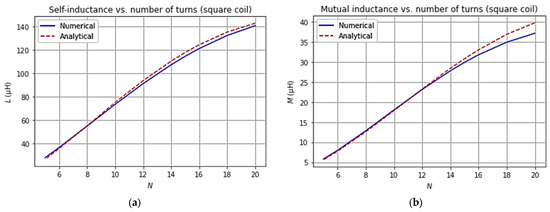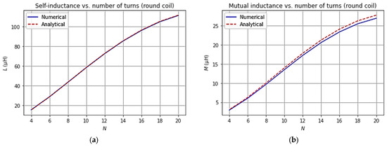 Comparison of the circular coil inductances obtained by the FEM model and analytically: (a) self-inductance vs. number of turns; (b) mutual inductance vs. number of turns ().