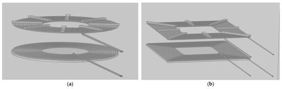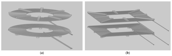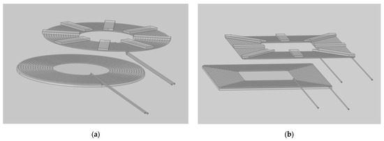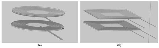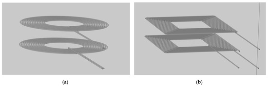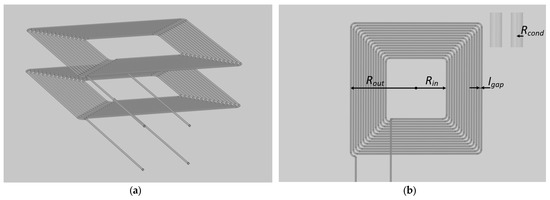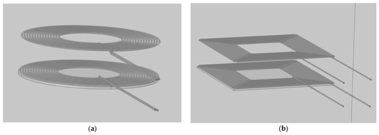The self and mutual inductances of the square planar coils (Figure 5) were calculated analytically using the expressions presented in [23]. The self-inductances of the square coils were calculated according to the Wheeler formula for square coils [38]: